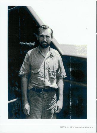 A photograph of Elmer Huter Jr. on the conning tower of the USS SILVERSIDES.