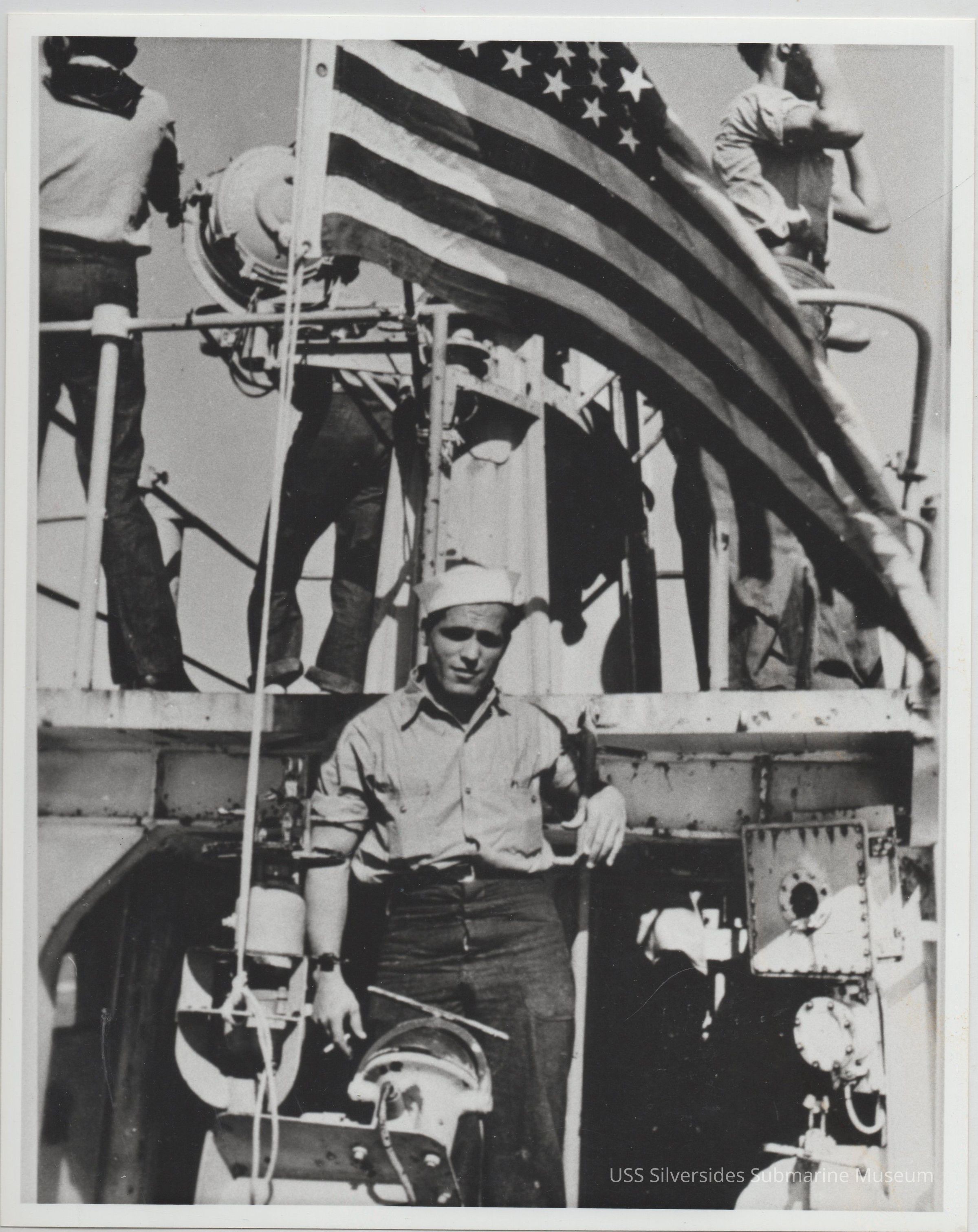 8" x 10" black and white photograph, copy of original photograph label reads: "F2c Ludwig Zarembinski "Off" lookout Circa 5 Oct 1943 - 22 Jan 1944 7th or 8th Patrol" 5.5" x 8.5" printed copy of photograph, in pen: "Ludwig F1/c Zarembinski F2/c (in foreground) 7th or 8th Patrol?"Acquisition