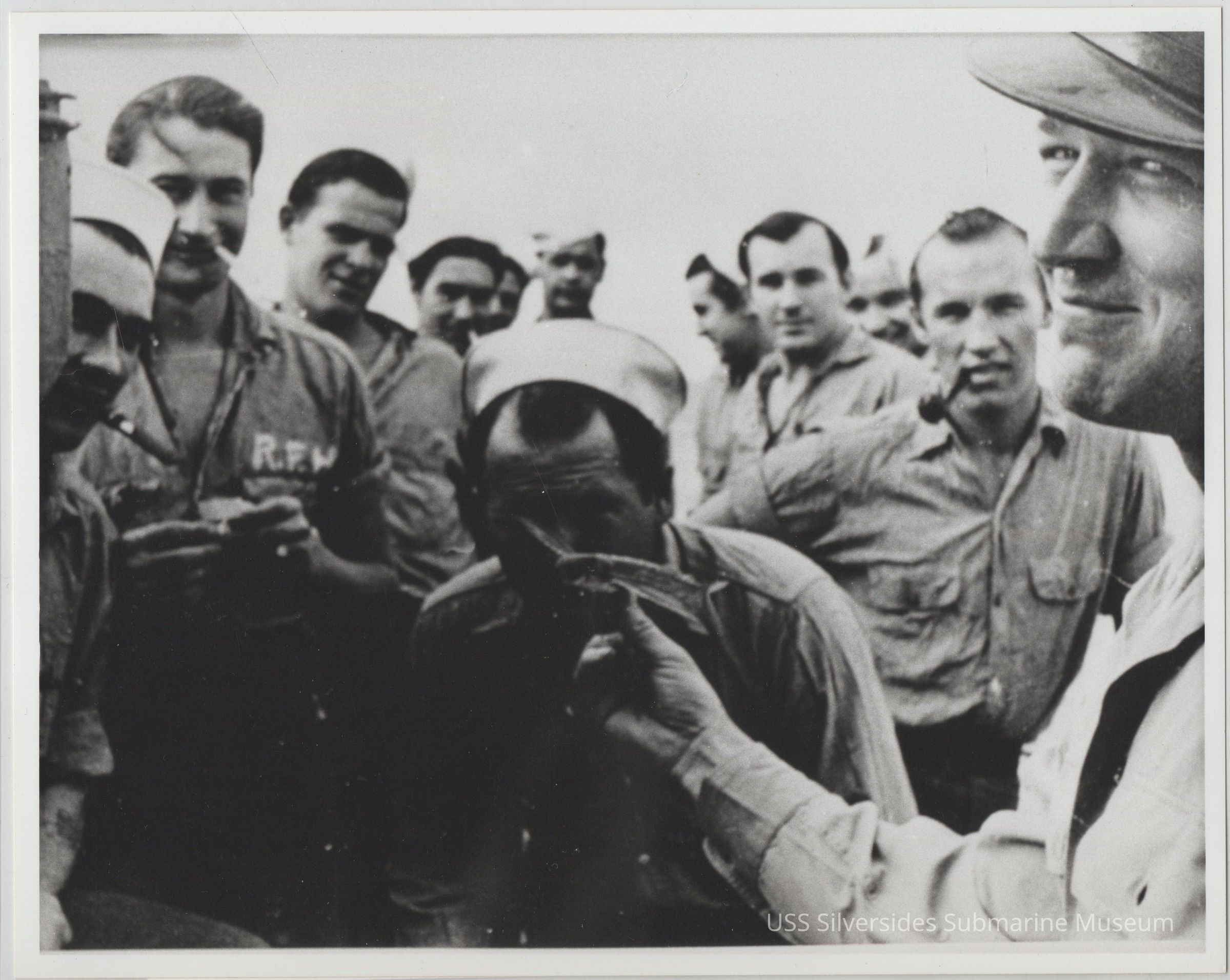8" x 10" black and white photograph, copy of original photograph label reads: "Some of crew examining "flying fish" on "Cigarette Deck" CTM Walter Czerwinski (rt) and QM1c Geo. L. Goodman (ctr) Circa 26 Apr - 11 June 1944 10th Patrol" 5.5" x 8.5" printed copy of photograph, in pen: "10th War Patrol (Apr-Jun1944) George L. QM1c Goodman Feb '44 - Summer '44 examining "flying fish" TM1c CTM Walter J. Czerwinski Dec 10, '42 - Early '43 Sep 27 '43 - Summer '44 10th Patrol"Acquisition