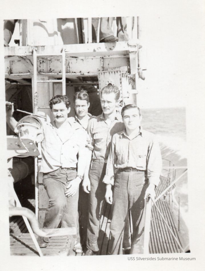 Black and white photo of four enlisted sailors standing on the cigarette deck of the Silversides. The sub appears to be underway. 3 names written on the reverse read Kelly, Borowski, and Harris. Vehmeier's name is also written but has been scratched through.Acquisition