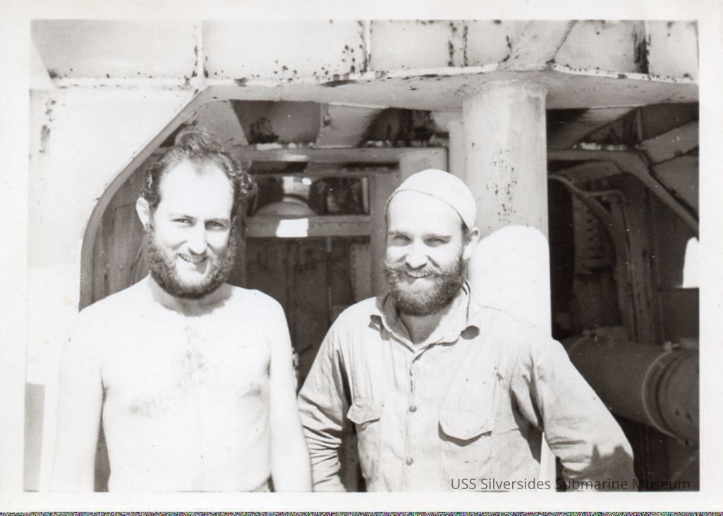Black and white photo of Everett W.R. Grimm and Robert Detmers standing beneath the bridge of the Silversides.Acquisition