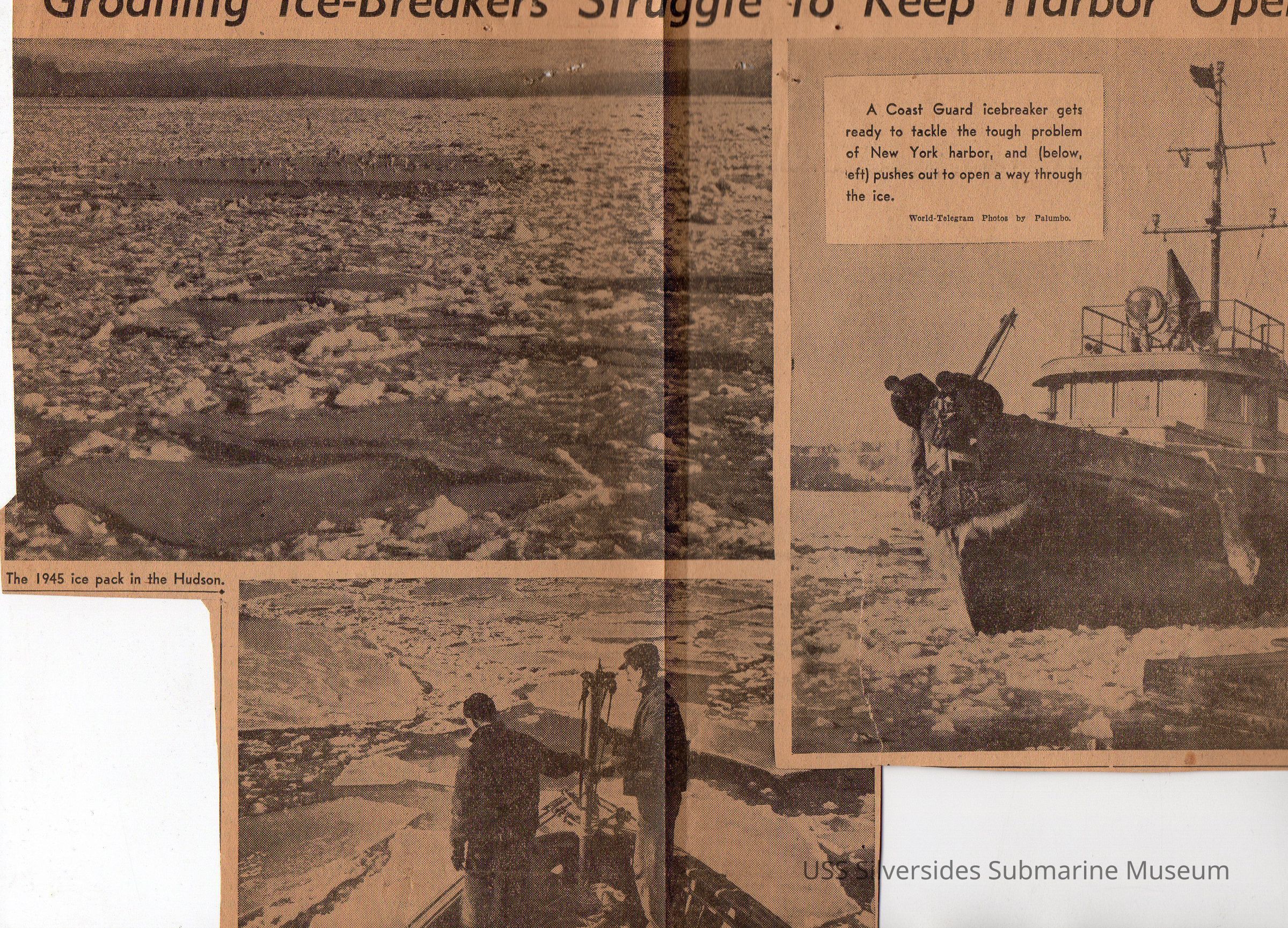 Newspaper clipping with several photographs titled 'Groaning Ice-Breakers Struggle to Keep Harbor Open'. There is a caption on one of the photographs that reads "A Coast Guard icebreaker gets ready to tackle the tough problem of New York harbor, and (below, left) pushes out to open a way through the ice."Acquisition