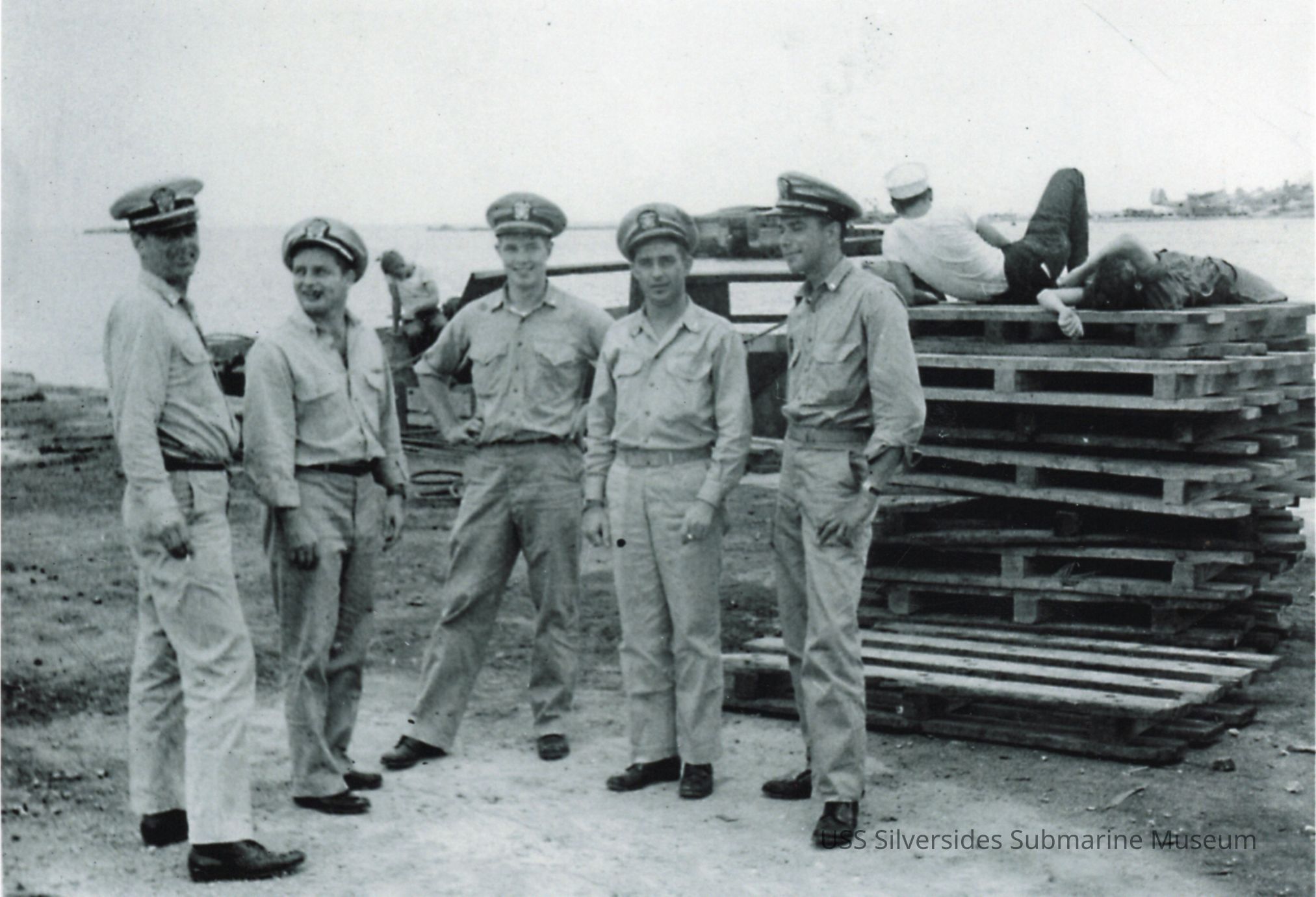 Black and white photo of 5 Navy officers standing near a stack of wood pallets. This is an enlarged copied version of 2012.036.008.Acquisition