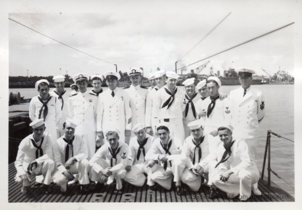 Photo of 4 officers and 16 sailors on the deck of the Silversides.