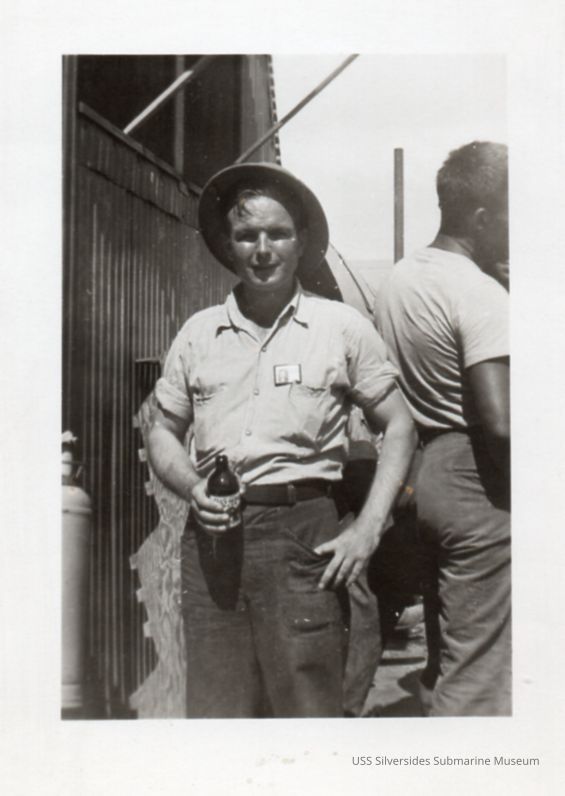 Black and white photo of EM3c James G. Hall taken at Pearl Harbor. Writing on reverse reads: Hall Pearl Harbor.Acquisition