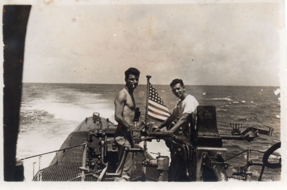 Black and white photo of Ens/Lt. jg J. R. Hammond and S1c Howard G. Watson on the cigarette deck of the Silversides next to an anti-aircraft gun. The sub is underway.Acquisition