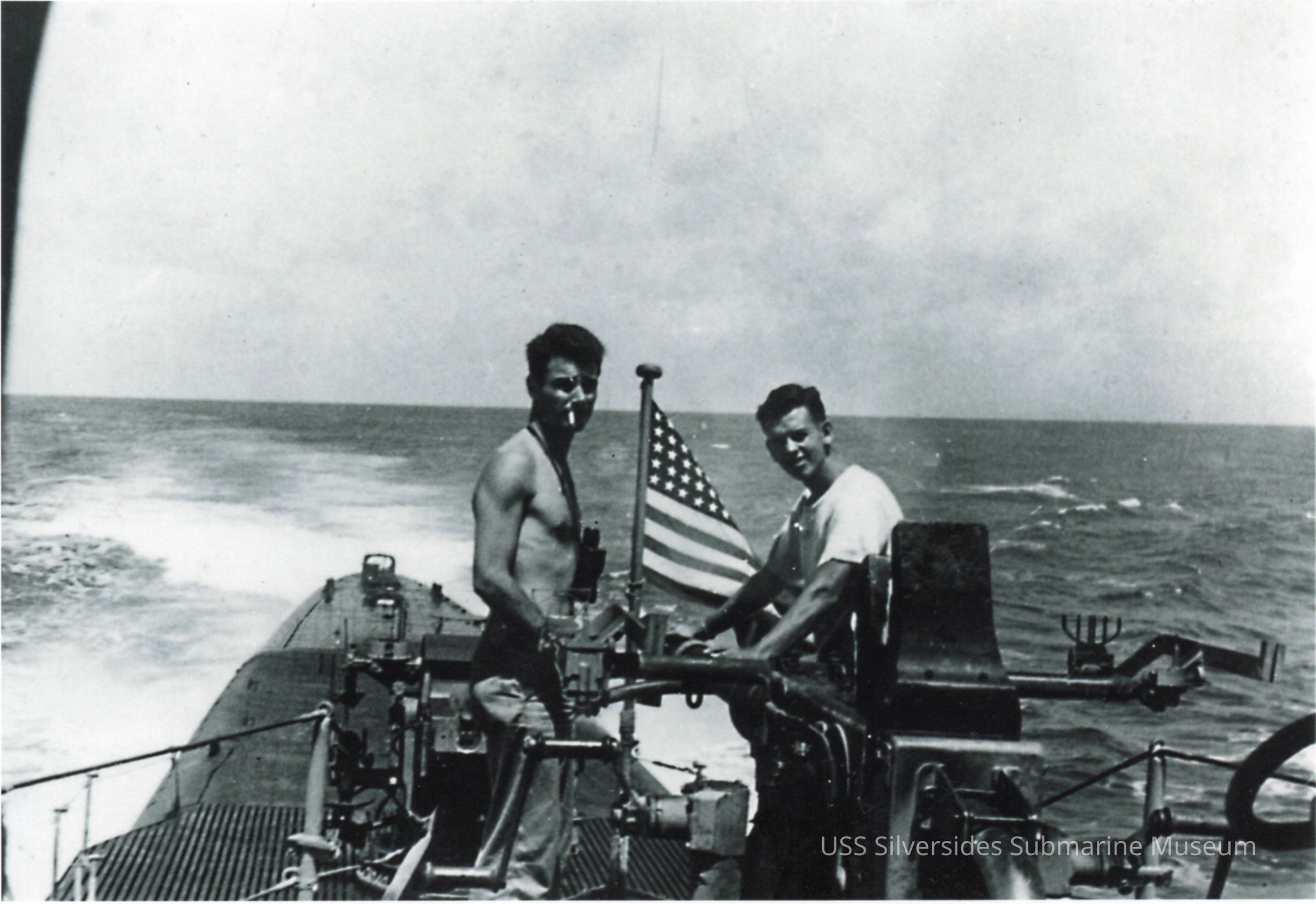 Black and white photo of J.R. Hammond and James Watson Standing next to the anti-aircraft gun on the cigarette deck. The camera faces aft showing the sub is underway. This is an enlarged copied version of 2012.036.020.Acquisition