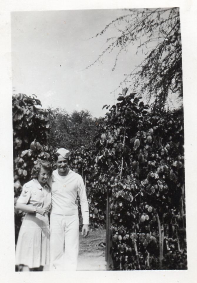 Black and white photo of either Vernon Harris or Robert Harris with an unidentified woman. Both served on the Silversides during patrols 12 - 14 and 8 - 14 respectively. Writing on reverse reads: Harris Honolulu.Acquisition