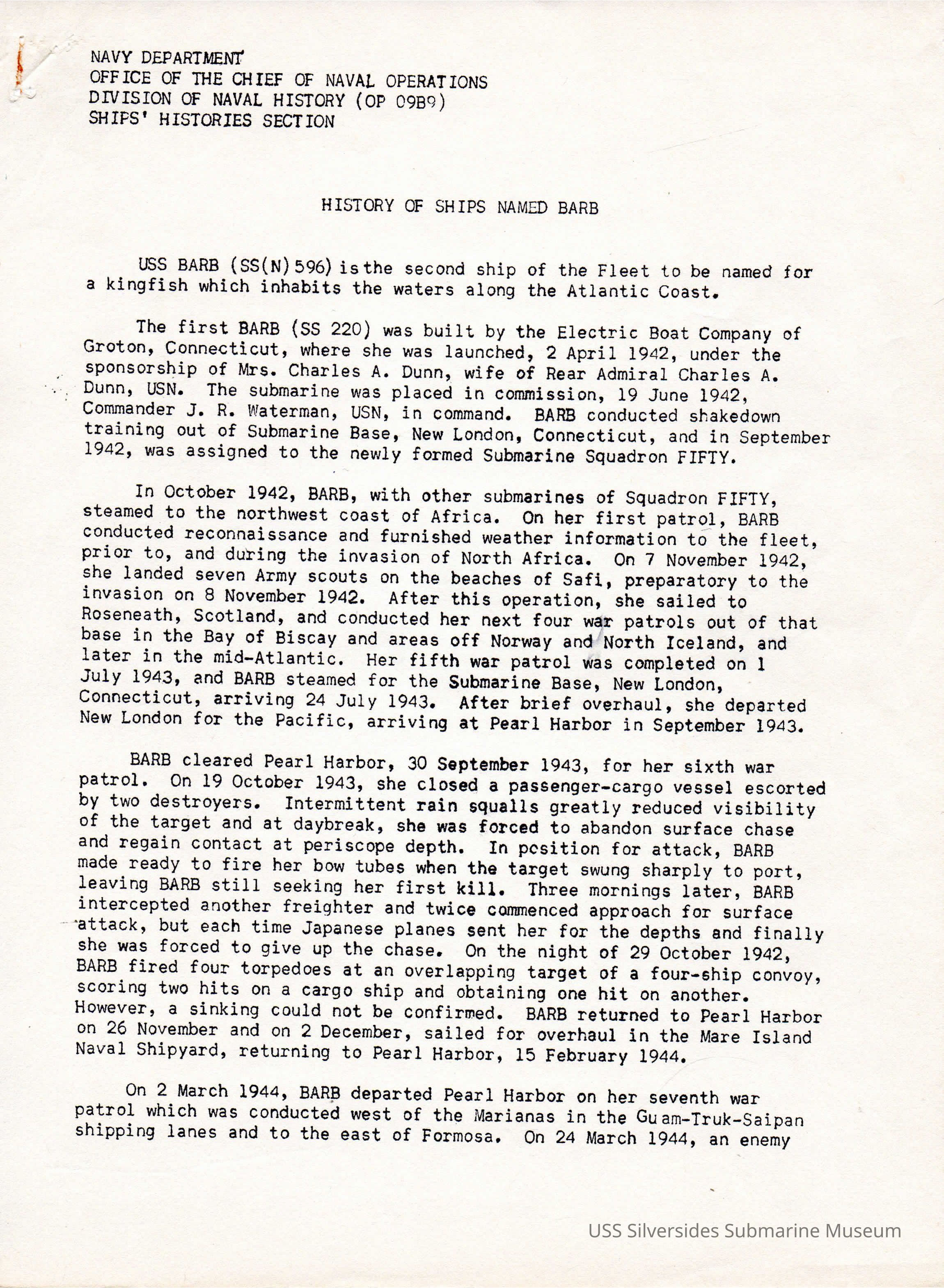 Photocopy of a brief war history of ships named Barb.