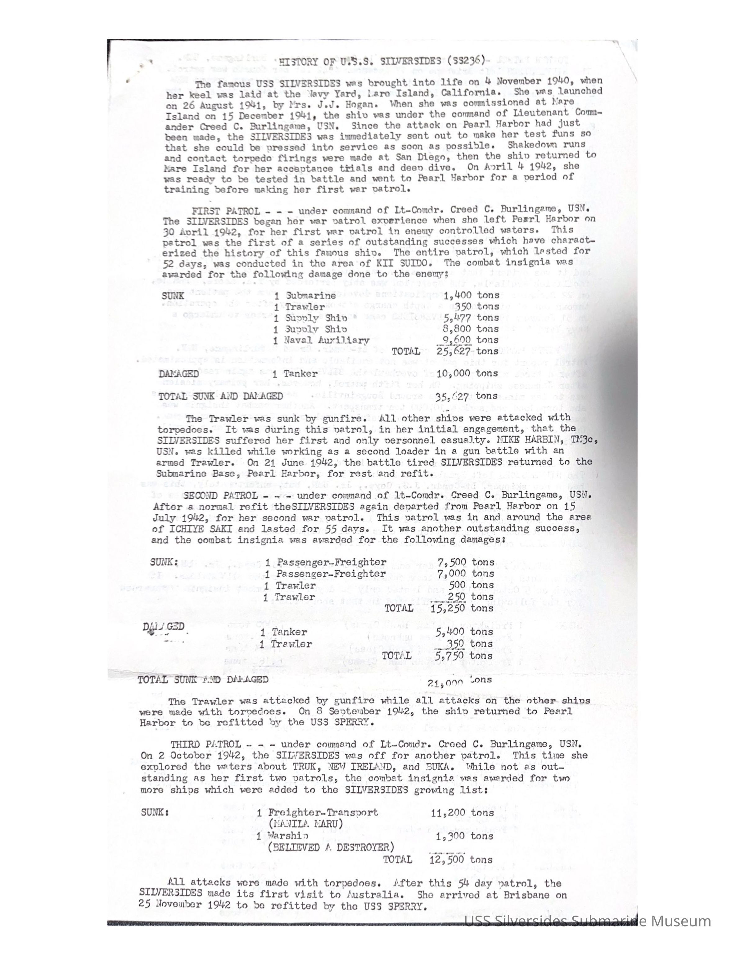 3 page document titled "History of the USS Silversides SS-236." Page one and two are two sided. Documents cover the history of USS Silversides combat history including patrol descriptions and tonnage sunk. Item is on over-sized paper which was folded toward the bottom by donor.Acquisition