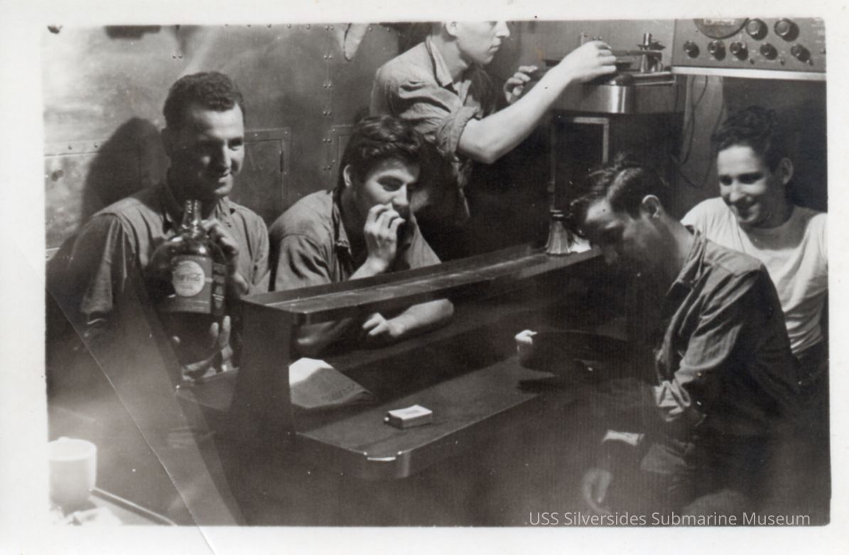 Black and white photo of 5 sailors in the Silversides crew's mess. Only one name written on the reverse reads, "Hoaglyn."