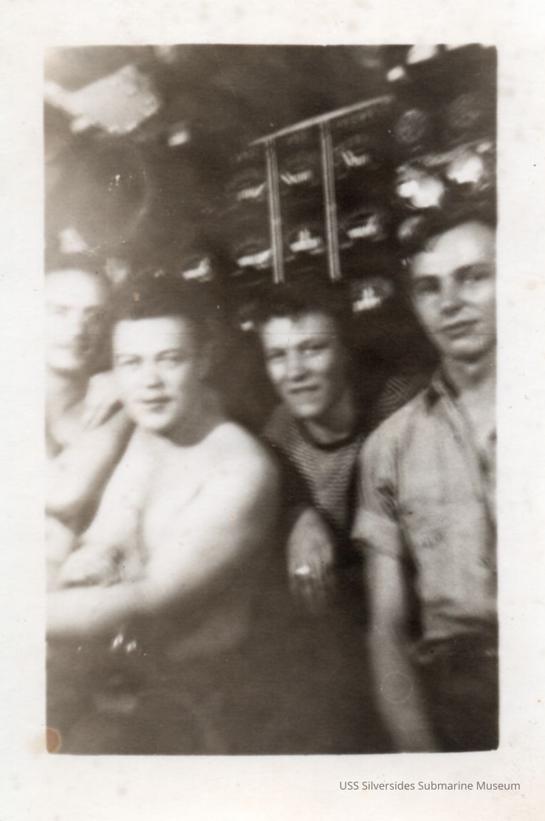 Black and white photo of 4 Silversides crewmembers in the maneuvering room. Names written on the reverse read: Sanderson (Edward), Gustafson (Raymond), Armitstead (Charles), and Ruhl [Rule] (Donald).Acquisition