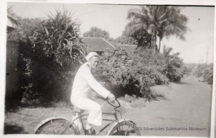 Black and white photo of Stanley Jacobson on a bicycle. Writing on reverse reads: Jacobson Honolulu.Acquisition