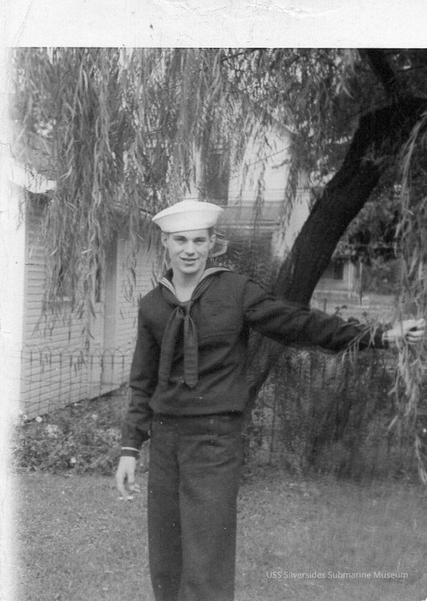 Small photograph shows Kastner wearing his blue US Navy uniform while standing under a willow tree.