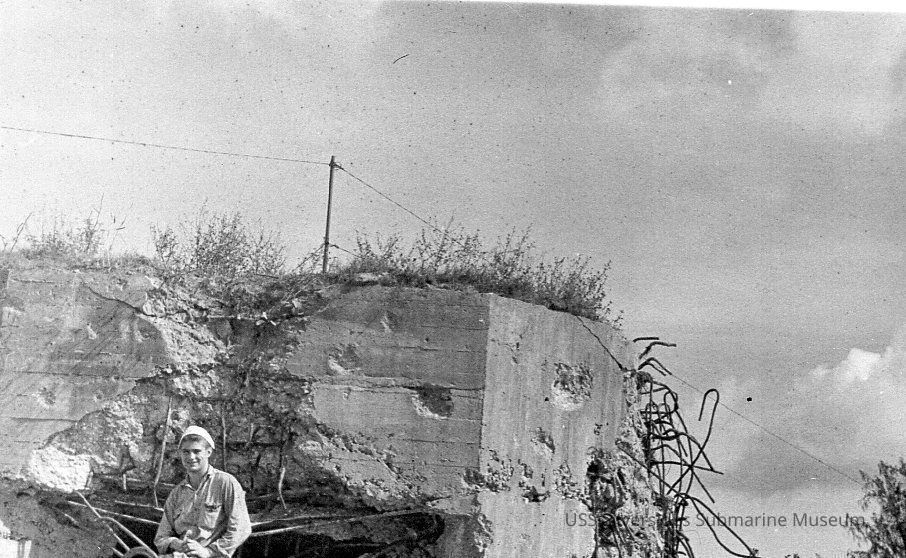 Small photo of James Kastner sitting on a gun in an unidentified location next to a heavily damaged structure.Acquisition