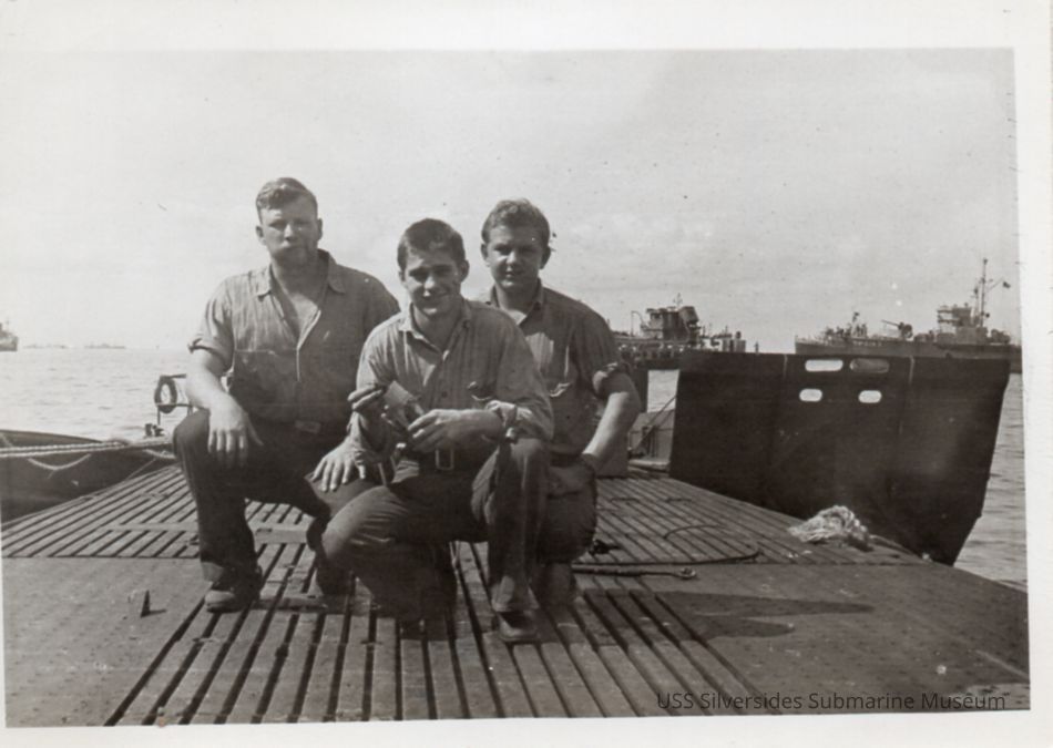 Black and white photo of 3 sailors crouching on the deck of the Silversides. Names written on the reverse reads, "Kastner, Russian (Manuel), Clark." The names Russian and Manuel don't appear on the enlisted men's roster. Vehmeier might have known how to spell Manuilow, referring to John Manuilow S1c/TM2c.Acquisition