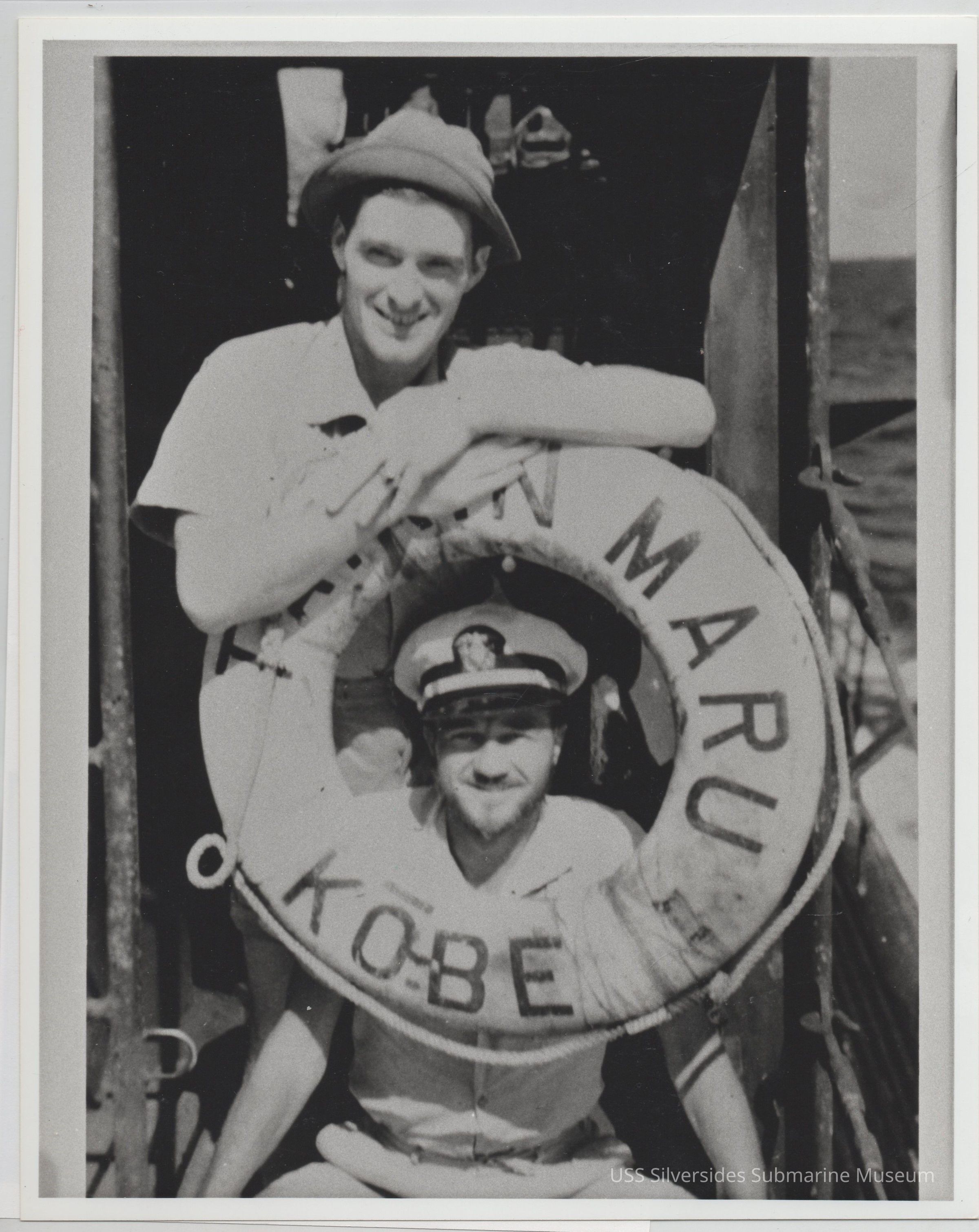 8" x 10" black and white photograph, copy of original photograph label reads: "LT. T.D. Keegan LT. John Bienea with TARIN MARU (Kobe, Japan) Life Preserver TARIN MARU sunk 18 Oct 1943 7th Patrol Circa Nov 1943" 5.5" x 8.5" printed copy of photograph, in pen: "Nov 1943 - 7th Patrol Lt.jg John Bienia (TAIKIN MARU SANK 17 OCT '43) Lt. T.D. KEEGAN"Acquisition