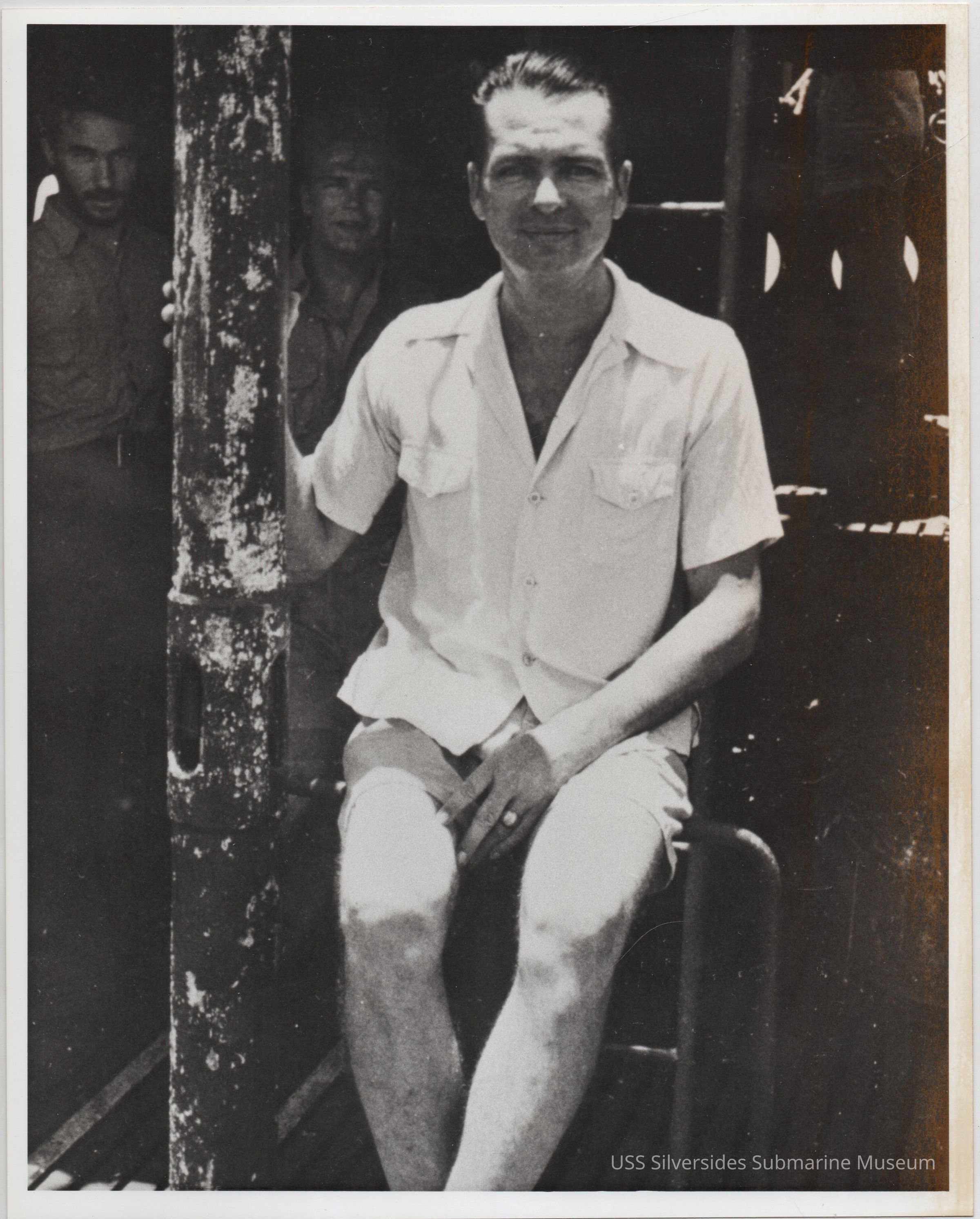 8" x 10" black and white photograph, copy of original, depicts Lt. Commander Davenport (foreground) and two other crew members. Label reads: "LCDR Davenport (XO) sitting on rung of ladder (2nd Patrol) 15 July-8 Sept 1942". printed copy of photograph 8.5" x 5.5" in pen: "LCdr Roy Davenport (exec)"Acquisition