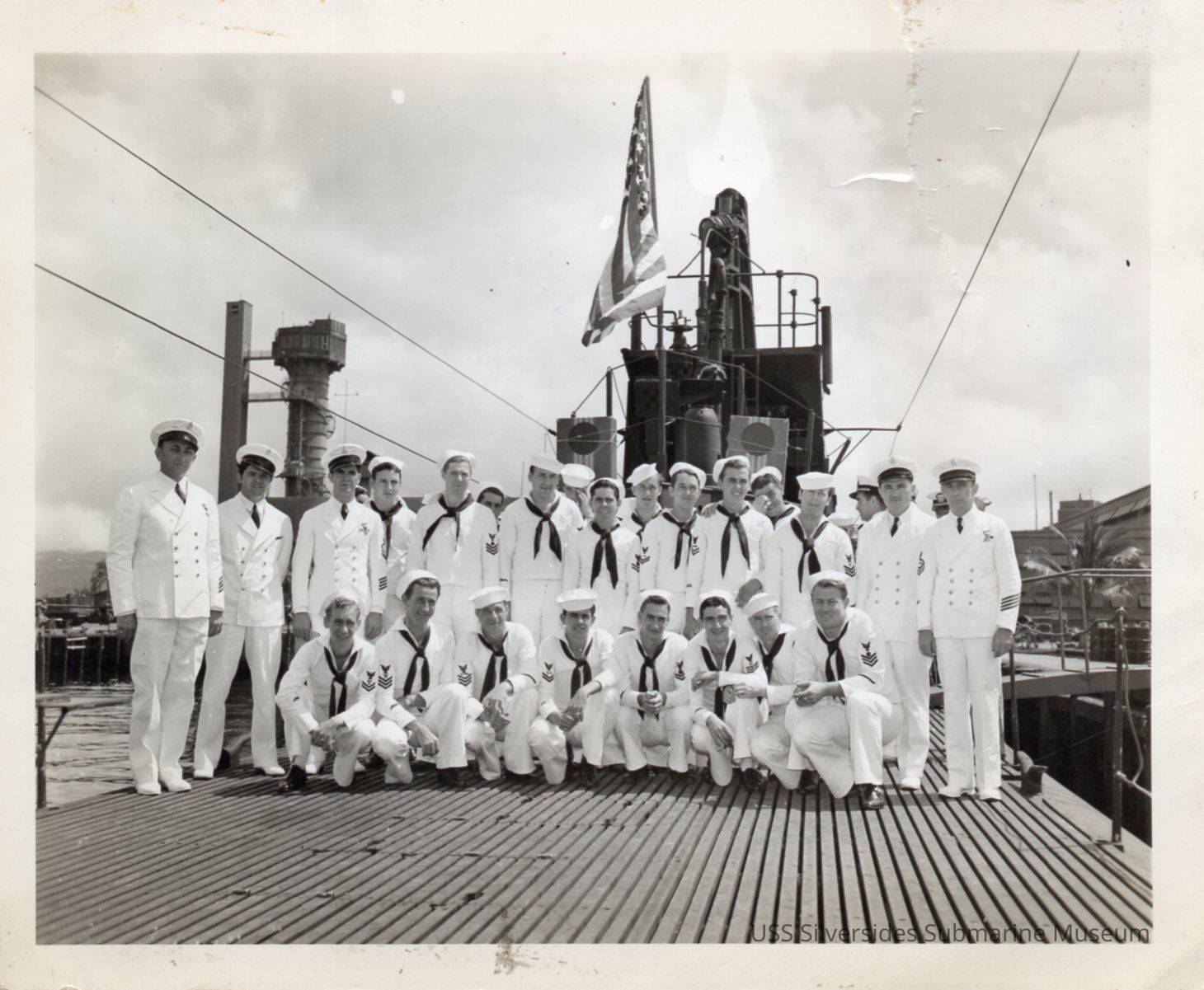Photo of some Silversides crewmembers taken on the deck of the sub. Writing on reverse reads: "Leave Party."Acquisition