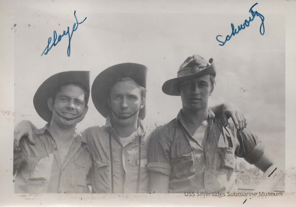 Photo of 3 sailors wearing "Digger" hats. The names of two are hand-written above their heads. On the left, Sea 2c/EM3c/2c/1c/CEM Calvin S. Lloyd. Lloyd was the only Silversides crew member to serve all of the sub's 14 war patrols.