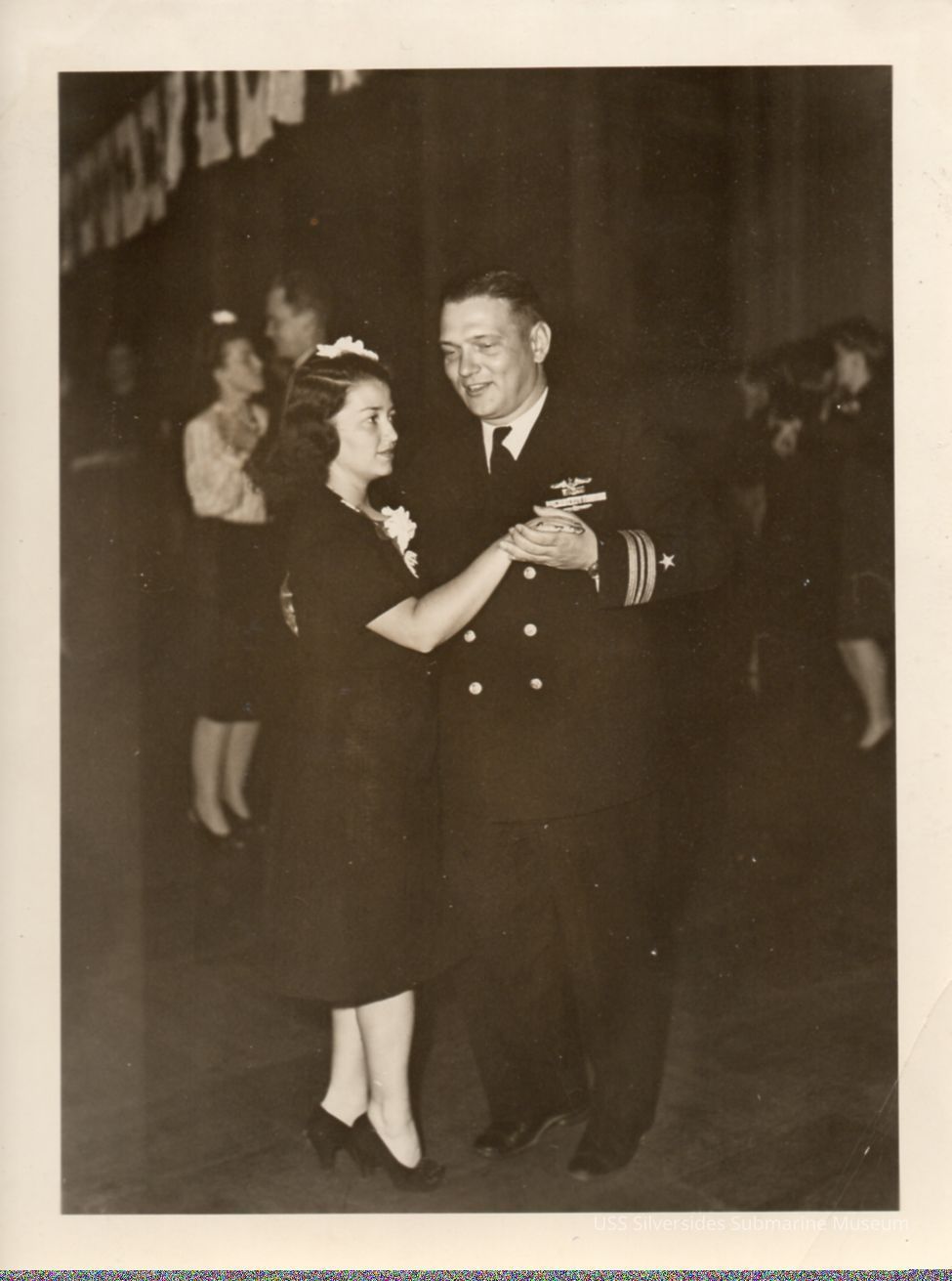 Black and white photo of Lt. Commander Jack Coye dancing with a woman at a dinner dance in San Francisco, 1944.Acquisition