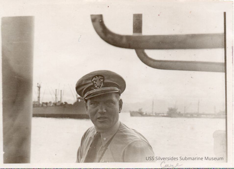 Black and white photo of Lt. Cmdr Jack Coye. Navy ships are visible in the background.Acquisition