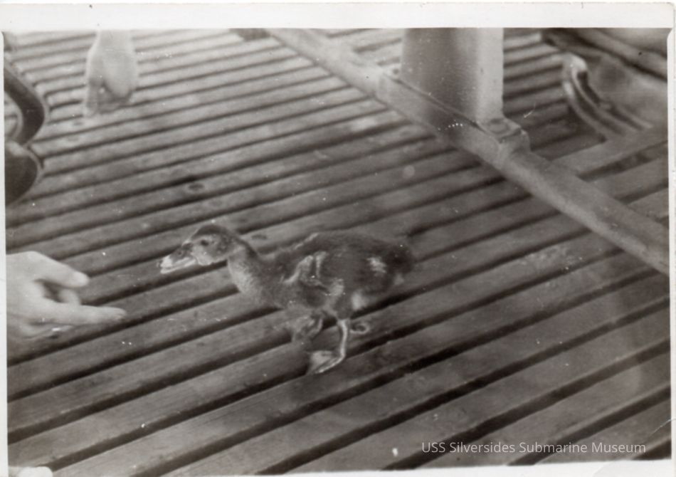 Black and white photo of a duck on the deck of a ship. Unclear if it's the Silversides. A hand of someone is visible as if trying to coax it with a treat.Acquisition