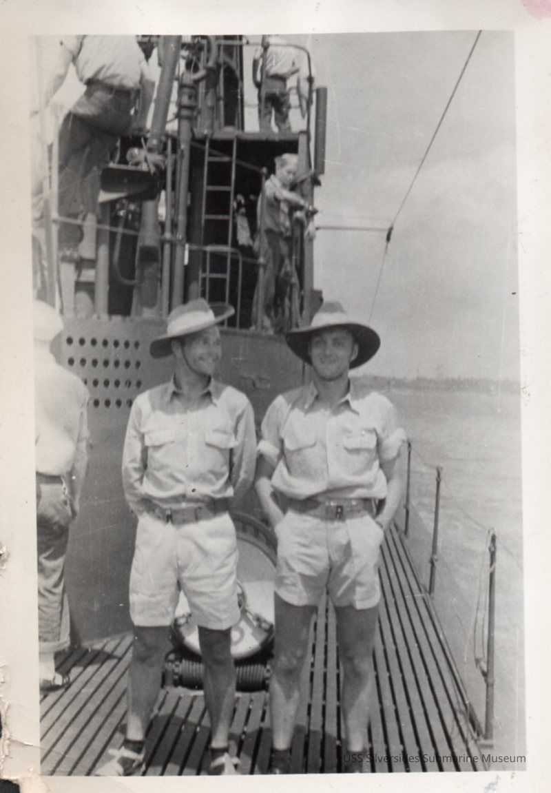 Photo of Silversides Lts. K.G. Nichols and Robert Worthington on the deck of the sub.
