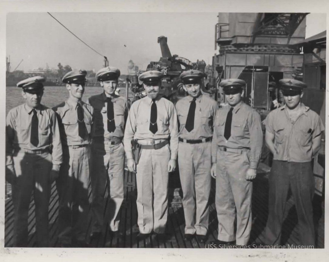 Photo of seven officers on the deck of the Silversides. Compared with other similar photos, this was taken at Sub Base Pearl Harbor in 1942.Acquisition