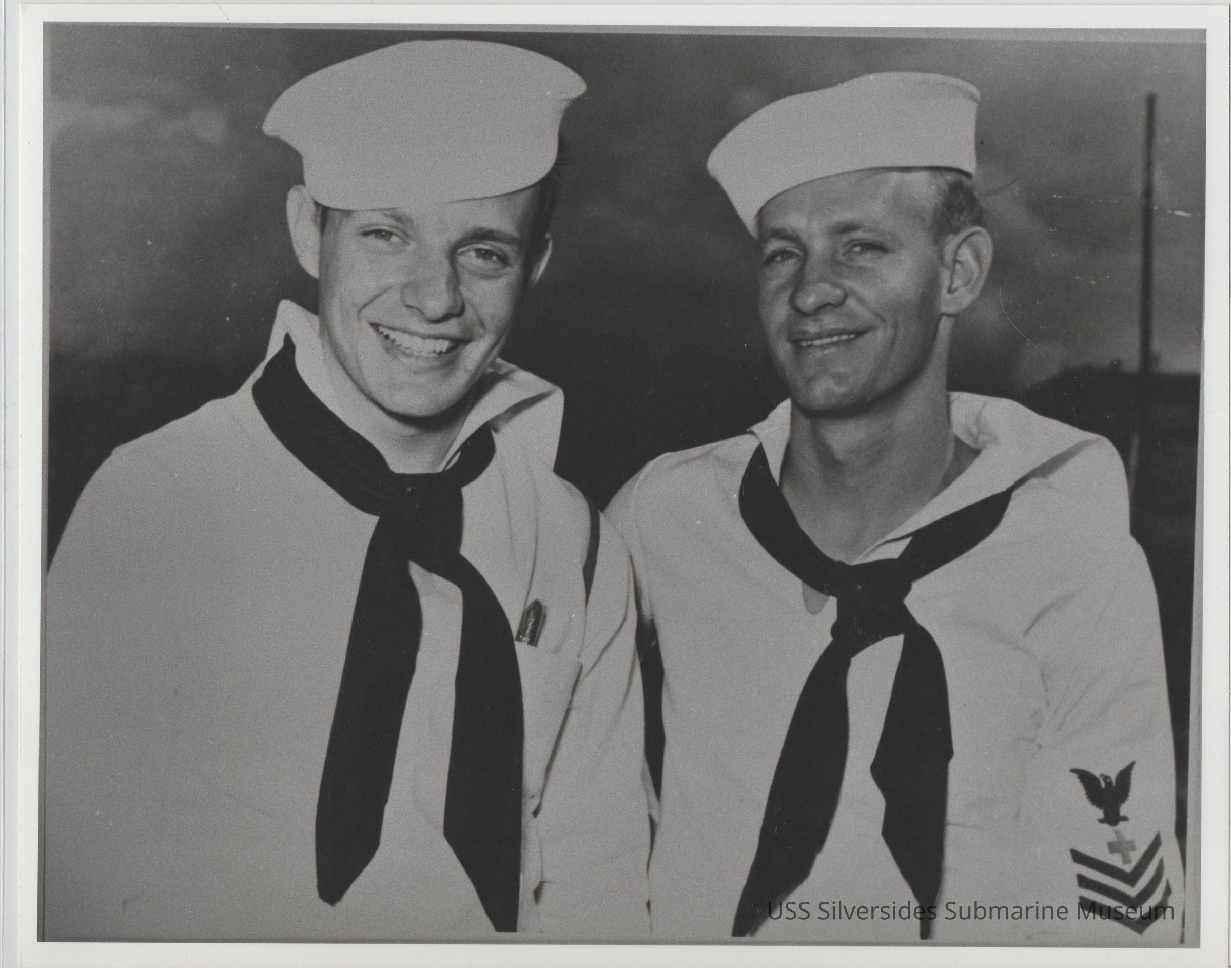 8" x 10" black and white photograph, copy of original photograph label reads: "Thomas Moore PHM1C and George Platter F2C After 4th patrol in Pearl Harbor, Hawaii circa Feb - Mar 1943 NA# 80-G-35664" 5.5" x 8.5" printed copy of photograph, in pen: "80-G-35664 (After 4th Patrol) Feb 1943 F3c George M. Platter PhM1c Thomas A. Moore"Acquisition