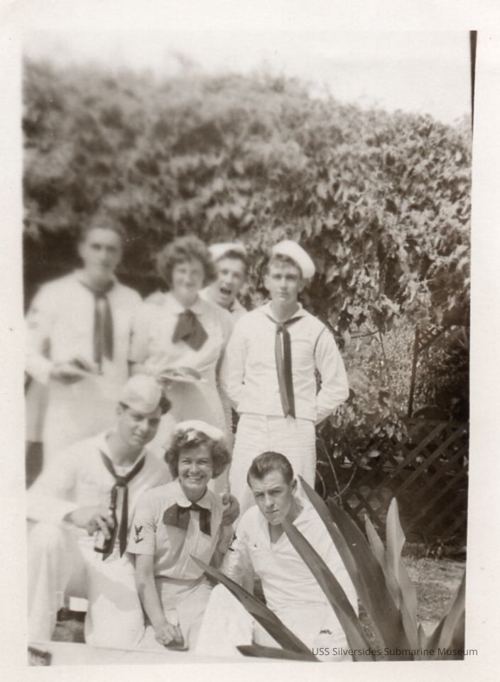 Black and white photo of a group of 5 sailors and 2 women. Writing on reverse reads: Keener (Ismael) Macaluso (Peter) Henry (Wendell) Honolulu.Acquisition