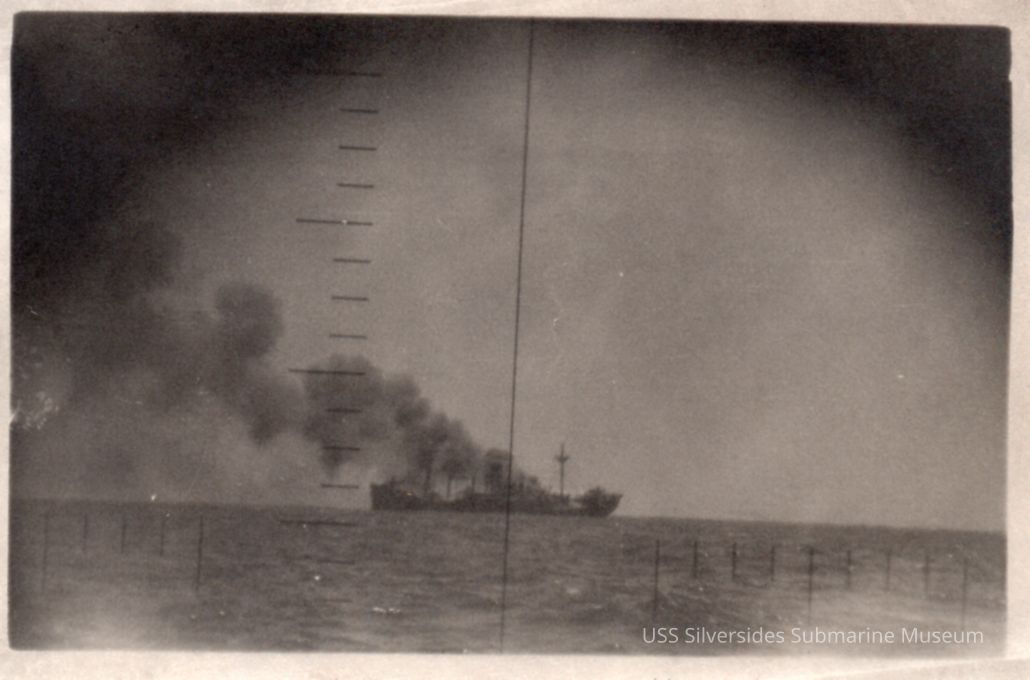 Black and white photo of a ship burning at sea. It has been taken through a periscope. It's nearly identical to 2012.036.059 but a smaller print. Writing on reverse reads: 10th War Patrol.Acquisition