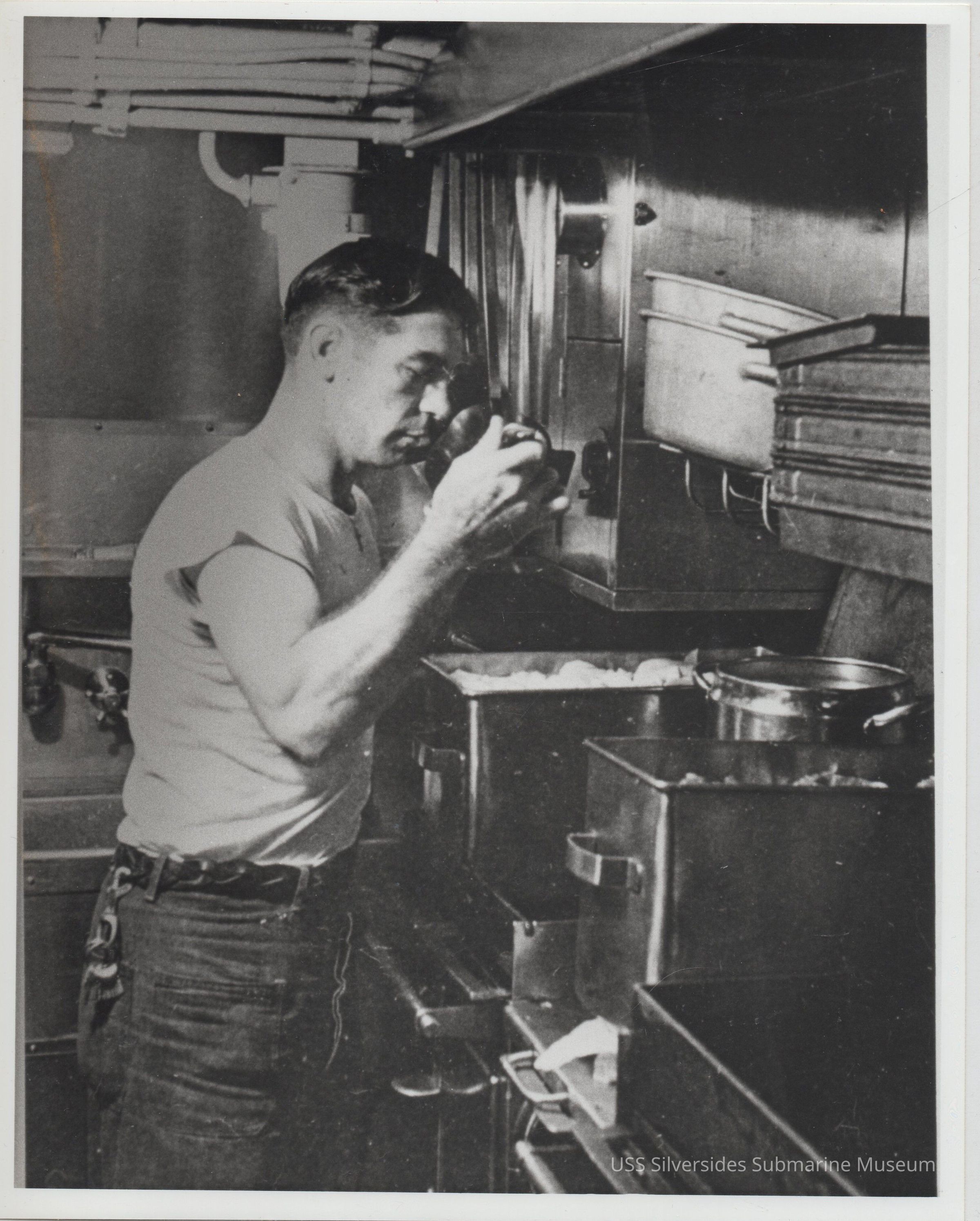 8" x 10" black and white photograph, copy of original photograph label reads: "SK1c Merl L. Crosbie Ship's Cook Circa 5 Oct 1943 - 8 Nov. 1943 7th Patrol" 5.5" x 8.5" printed copy of photograph, in pen: "Sc 1c SC 2c Merl L. SK 1c Crosbie (in galley) 7th or 10th patrol? Late 43- early 44 Galley"Acquisition