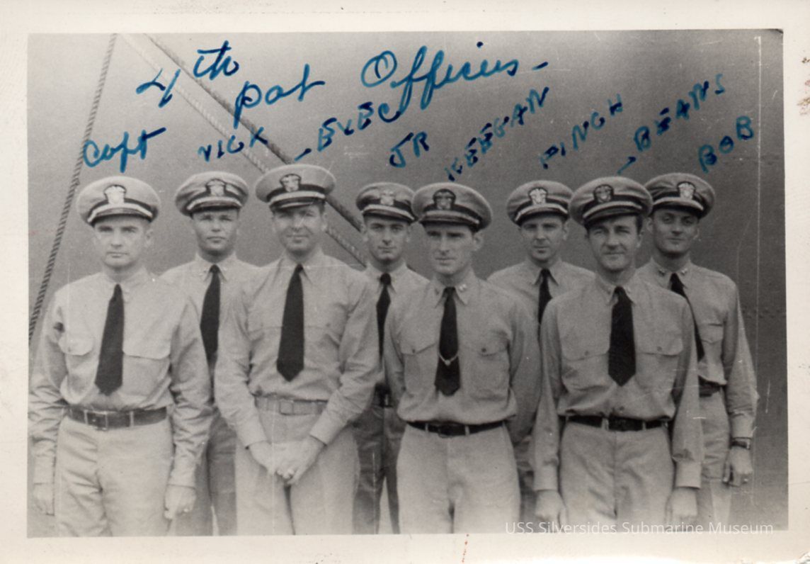 Photo of Silversides 4th war patrol officers L to R: Burlingame, Nichols, Davenport, Clarke(?), Keegan, Finch, Bienia, and Worthington.Acquisition