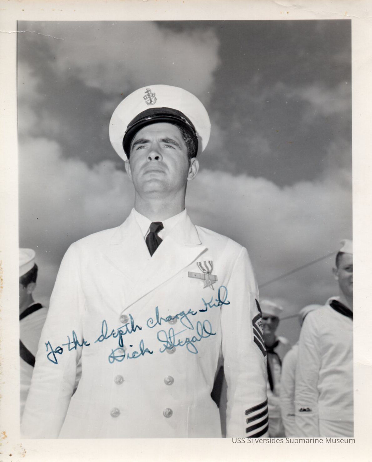Photo of A.H. Stegall, CRM AA after receiving the Silver Star. Writing reads: "To the depth charge kid, Dick Stegall."Acquisition