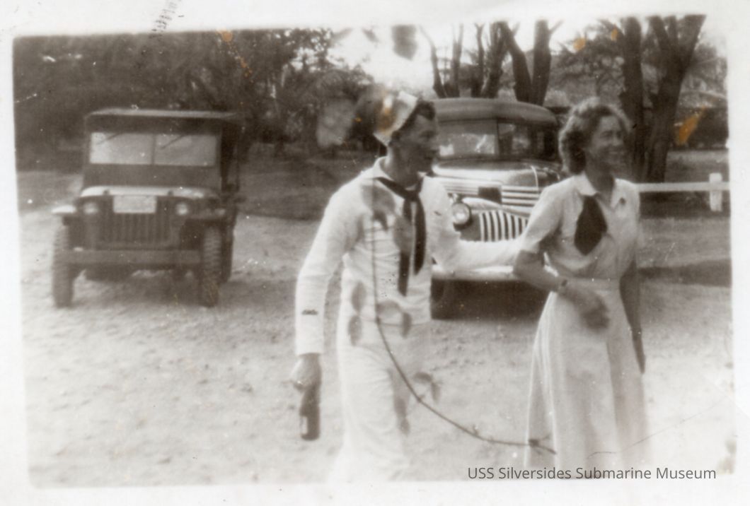 Black and white photo of F1c Thomas Albin and an unidentified woman. Writing on reverse reads: Thomas Albin Honolulu.Acquisition