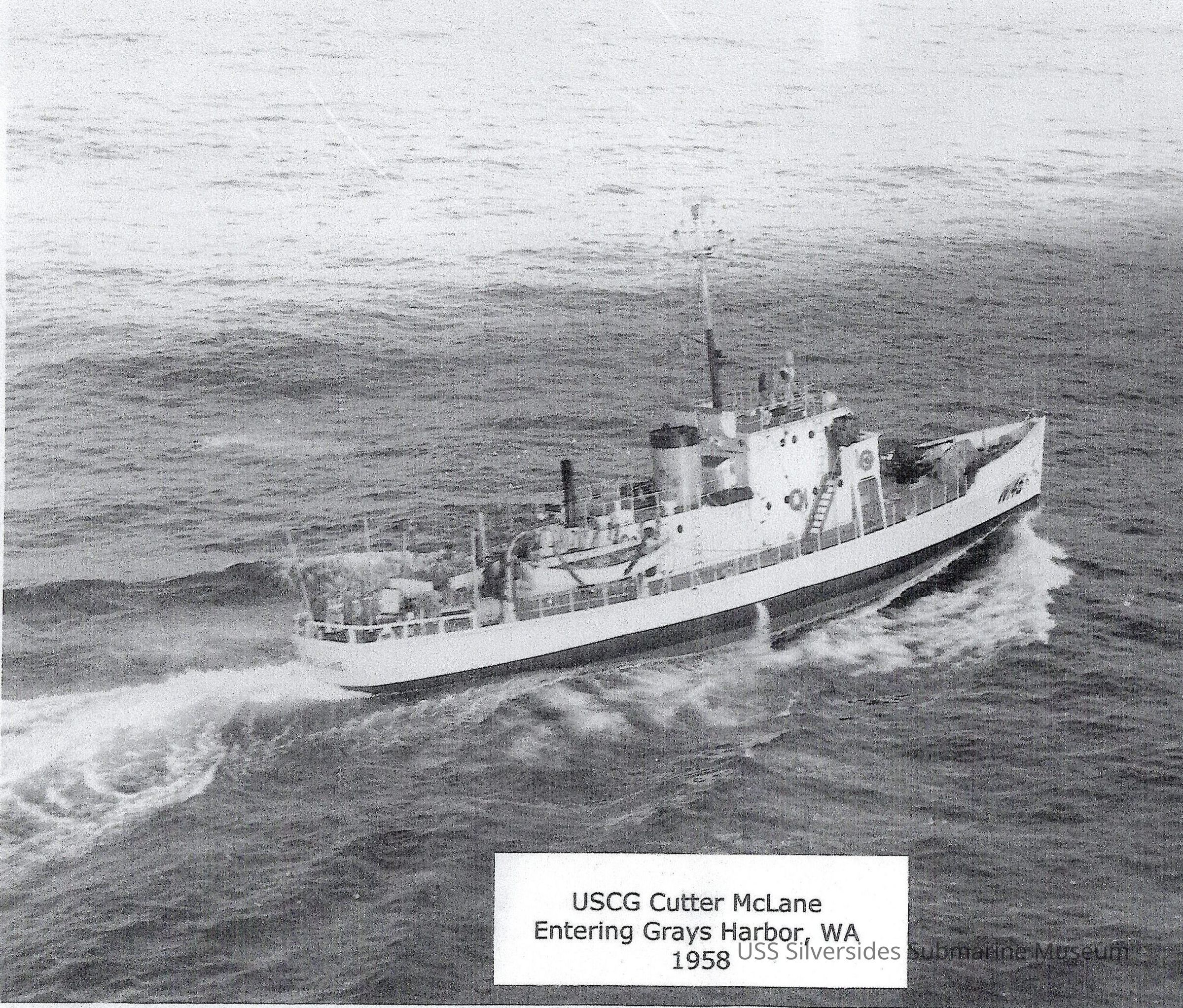 Copy of Photo of McLane entering Grays Harbor, Washington through open water. The bow of the ship is to the right. "USCG Cutter McLane / Entering Grays Harbor, WA / 1958" is at the bottom of the photo.
