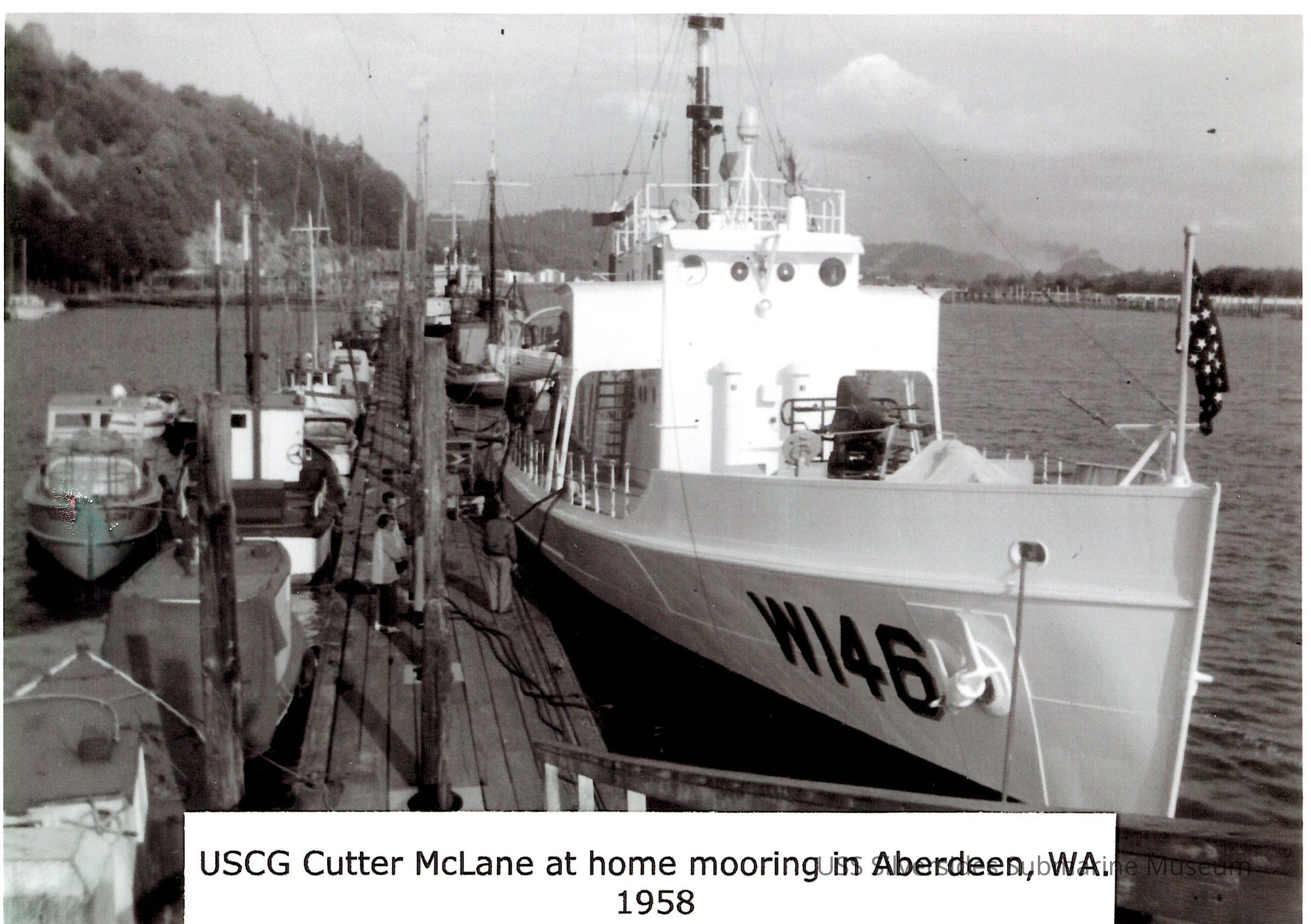 Copy of photo of McLane moored to dock with other boats. The bow is facing toward the observer. "USCG Cutter McLane at home morring in Aberdeen, WA. / 1958" is across bottom of photo.Acquisition