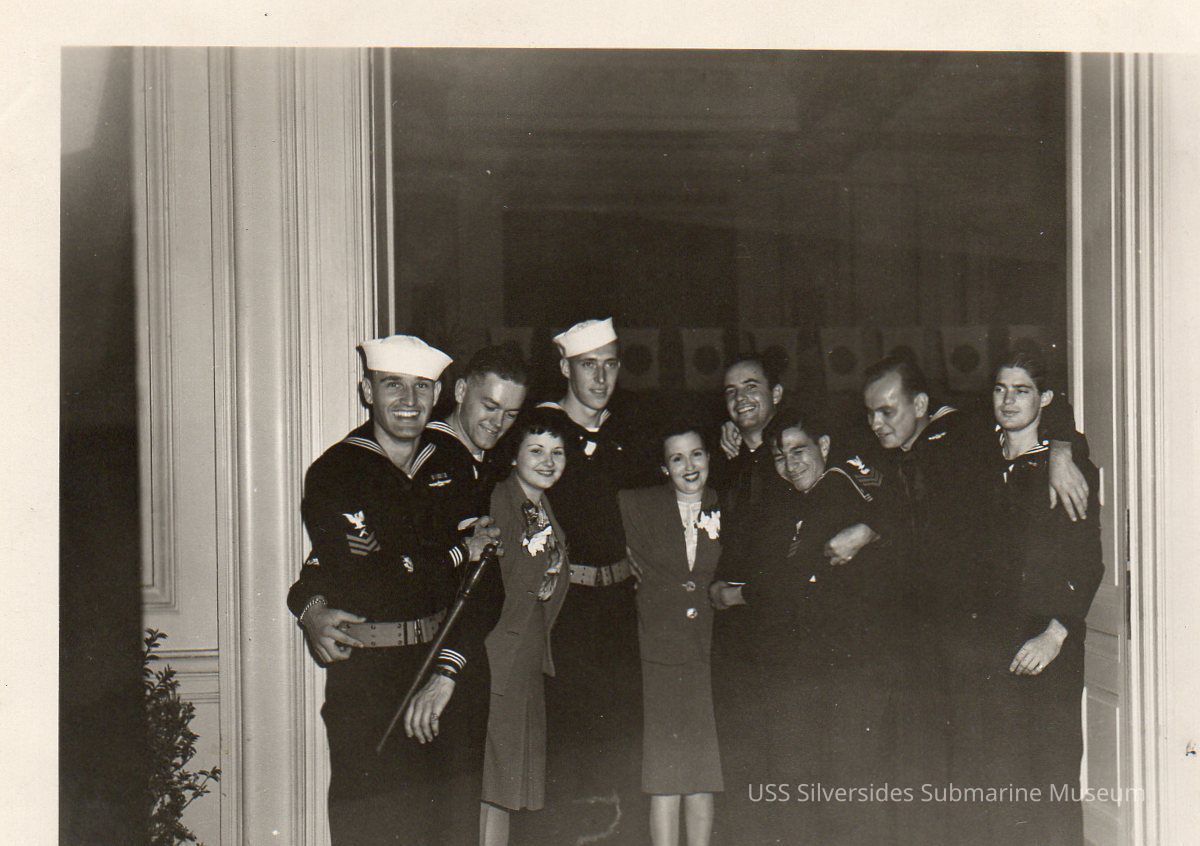 Photograph of James Kastner on the far right side of the frame, with six other men (all in naval dress) and two women. Robert Vehmeier is the 3rd sailor from the left. Kaster is on the far right. The photo was taken at the USS Silversides Ship's Party during the sub's refit period in San Francisco, 1944.Acquisition