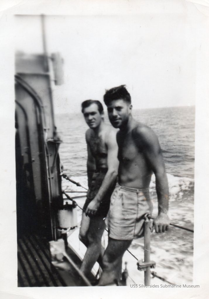 Black and white photo of 2 enlisted sailors on the Silversides' cigarette deck. The sub is underway. Name written on the reverse reads, "Wojaechowski." It's unclear which one is Wojciechowski.Acquisition
