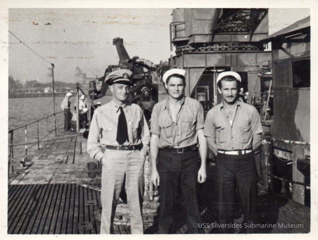Photo of Lt. Worthington (left) with Kenneth J. Little, GM1c (center) and Ramen Booze, FC2c/1c/CFC-a.