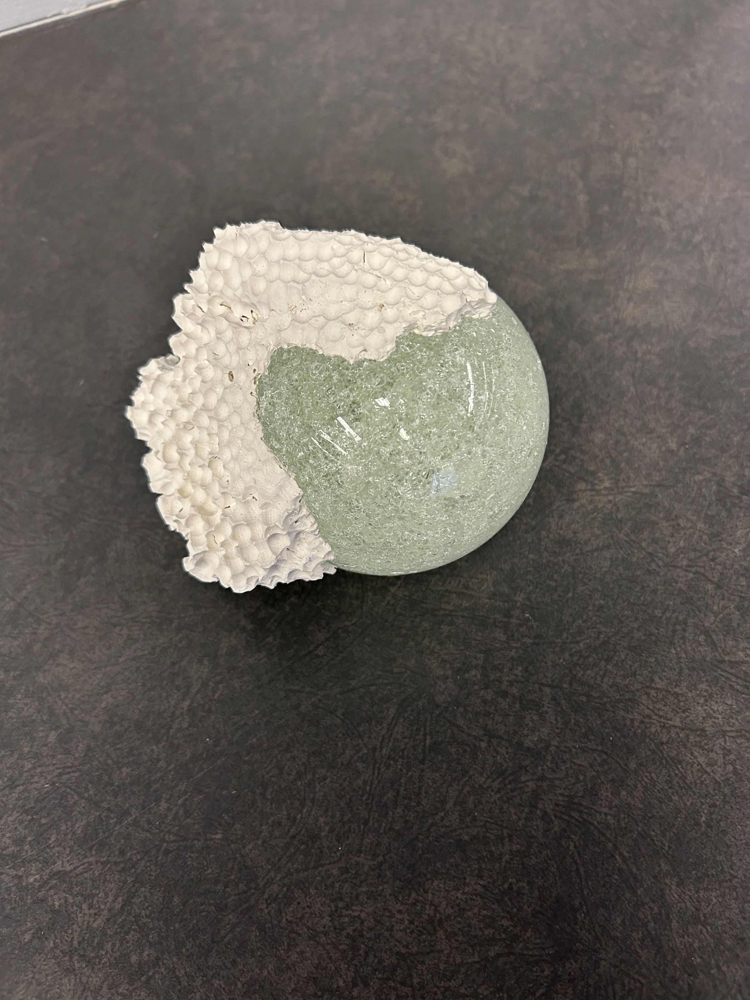 A small transparent exploded glass sphere with plaster attachment.Collection