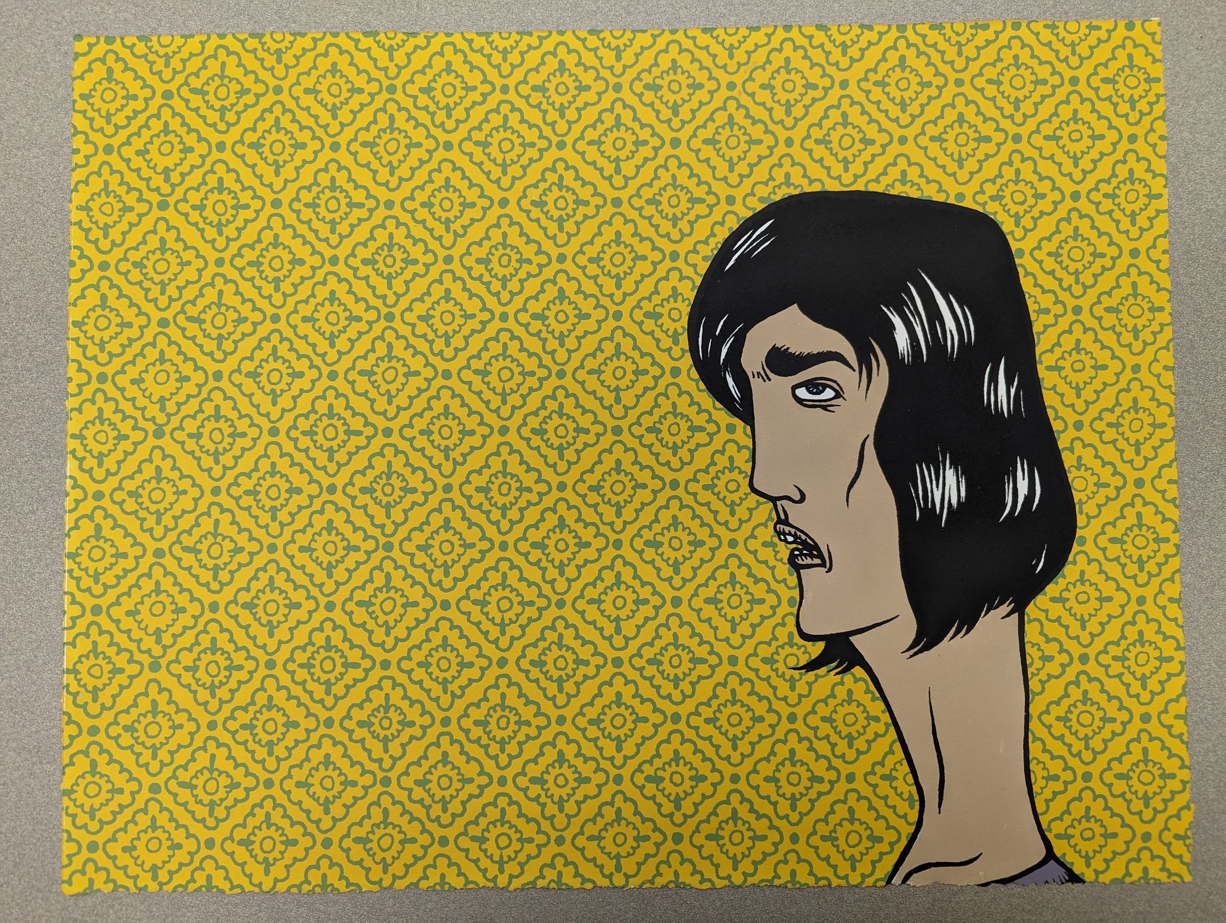 A horizontal print with a wallpaper-like background, green on yellow. On the right side is a girl's head in profile with the proportions squashed and exaggerated.Context
