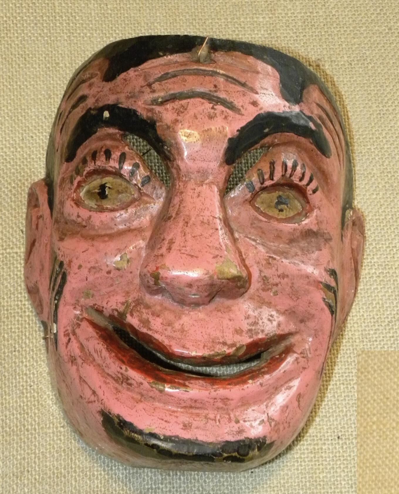 A life-sized square wood mask depicting a man with a peach-pink face. The hair is black. Black painted eyebrows are above cutout eyeholes for the wearer and painted eyes with black lashes. A large flat nose is above a smiling, open, red mouth. Sets of incised black lines create wrinkles. There is a small painted black goatee.A wire is attached to the back. Overall signs of paint loss and scratching.Context