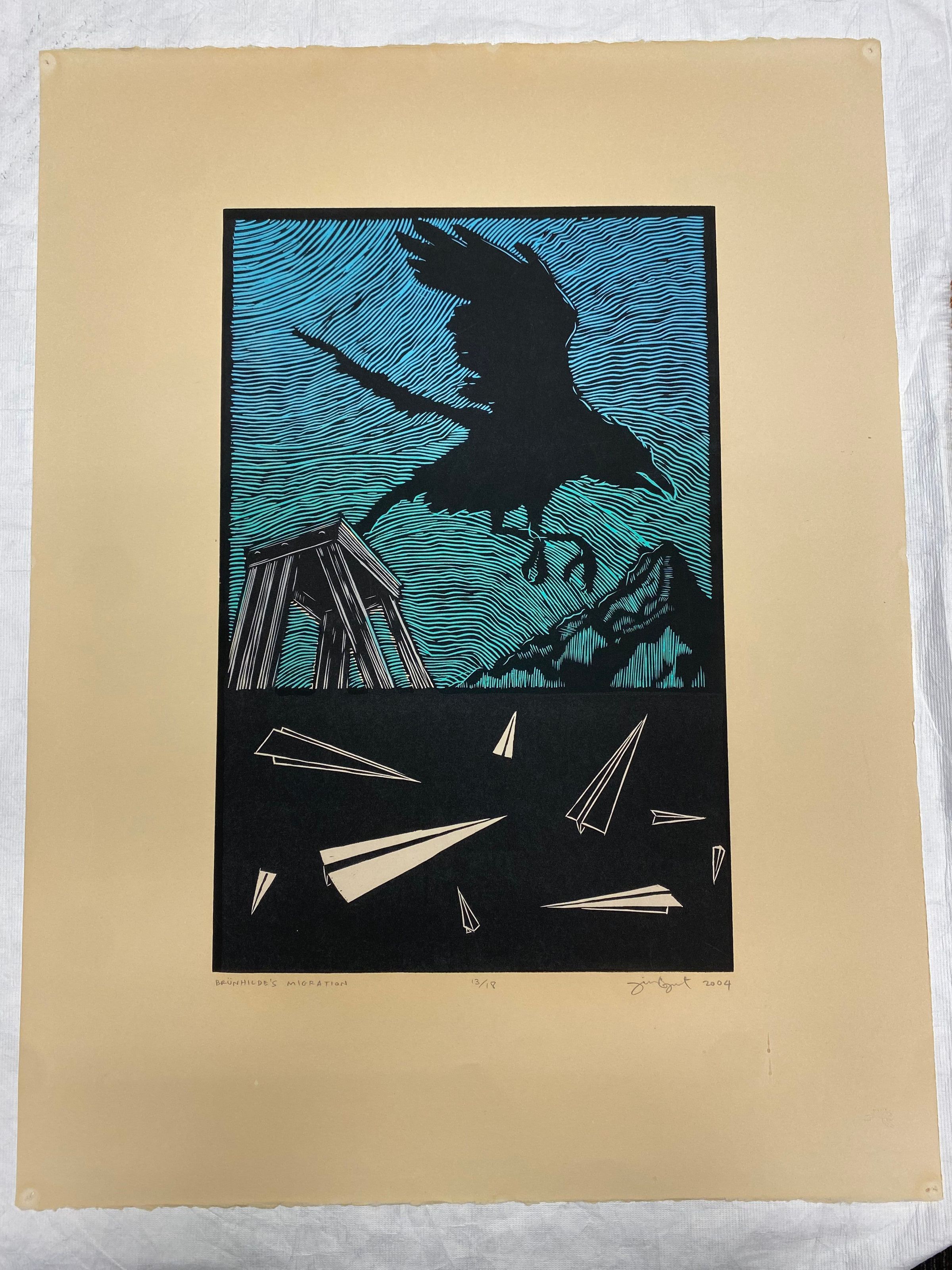 Large vertically oriented intaglio print of a bird flying away against aqua sky stylized with repeated black swirling lines. The bird flys from a ladder perch on the right to the left of the composition with a mountain in the background. Below paper planes of alternating sizes in white or black point in various directions.Context