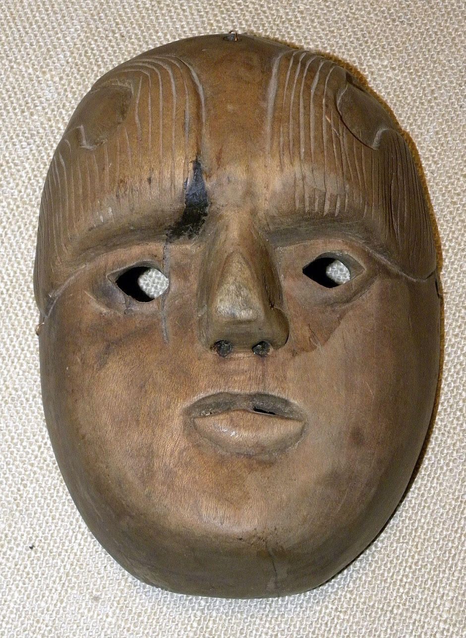 A life-sized oval unpainted wood mask depicting a figure with large, stylized eyebrows. Small cutout eyeholes are under the brow. A small nose is above a small, closed mouth. A wire is attached to the back of the mask.Context