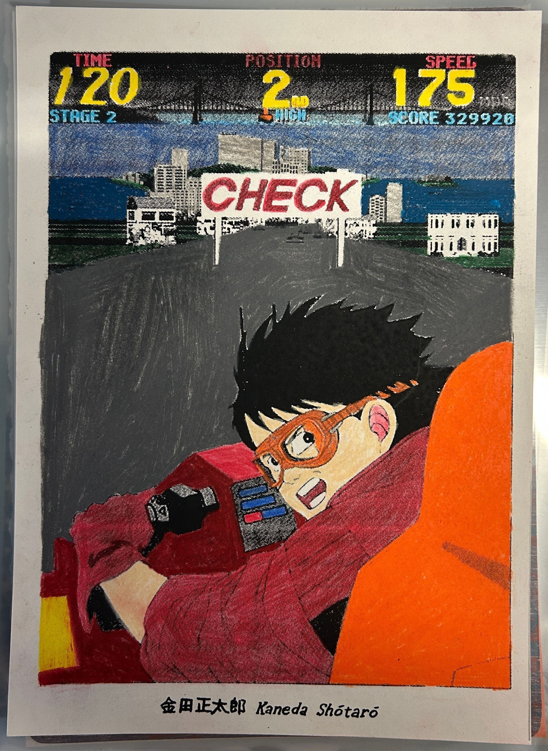 A small colorful print of Kaneda Shotaro, from the anime "AKIRA", riding a bike.Collection