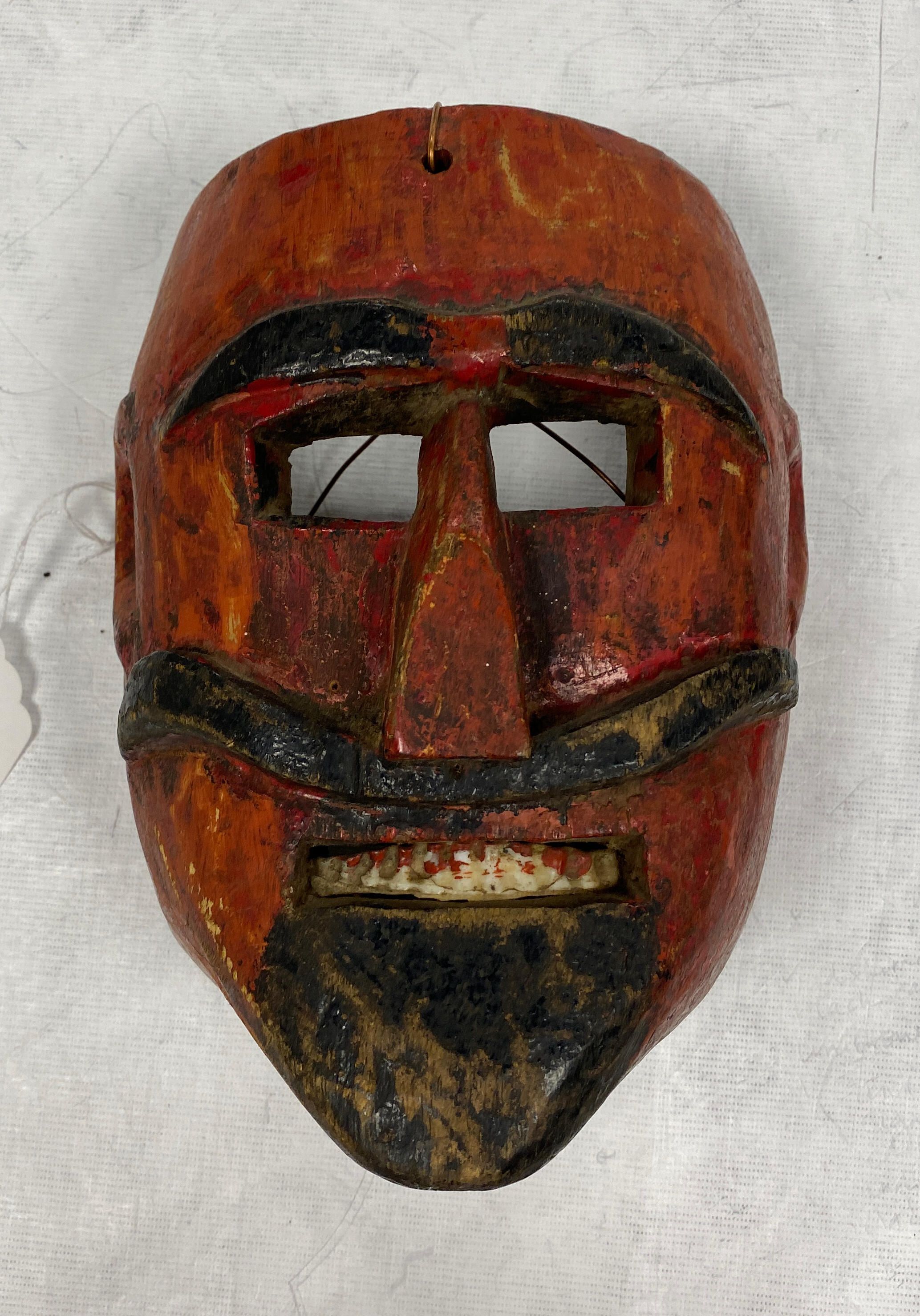 A life-sized oval wood mask depicting a figure with a red complexion. Black eyebrows are above cutout rectangular eyeholes. A triangular nose is above an upturned black mustache and an open mouth with white teeth. There is a black goatee. A wire is attached to the back of the mask. Overall signs of pigment loss.Context