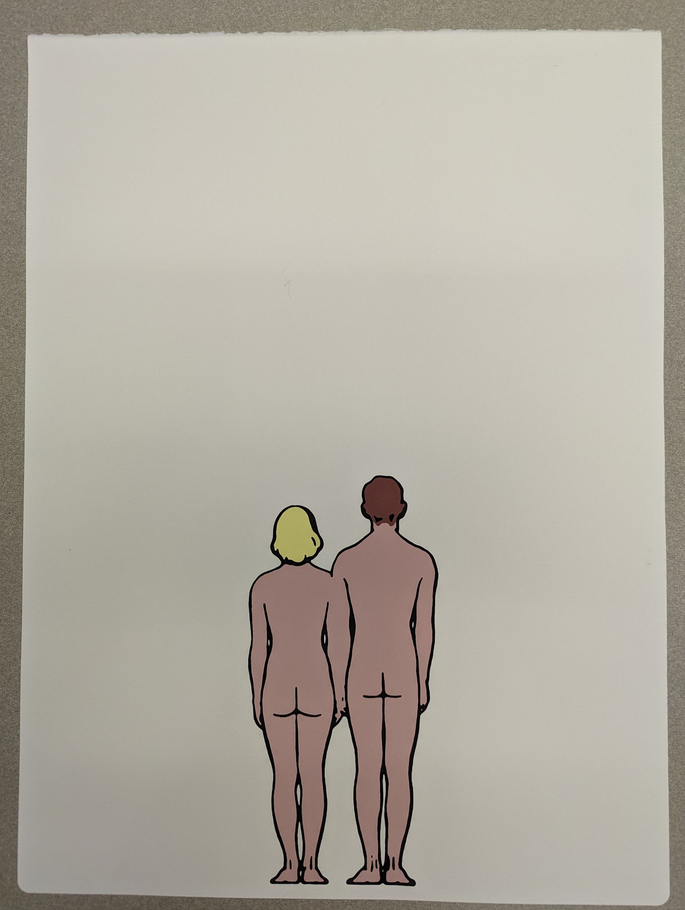 A large screenprint with the backsides of two nude figures (a man and woman) standing side-by-side in the bottom center, joined at the shoulders. They have the same skin color but the woman (on left) has blonde hair and the man (on right) has brown hair. The colors are flat and the contours are thick and simplified.Context