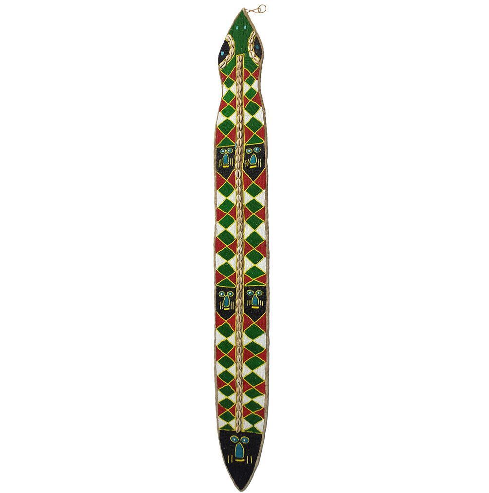 Long beaded textile in the shape of a snake with green, white, and red symmetrical designs and with a center row of cowrie shells.Collection